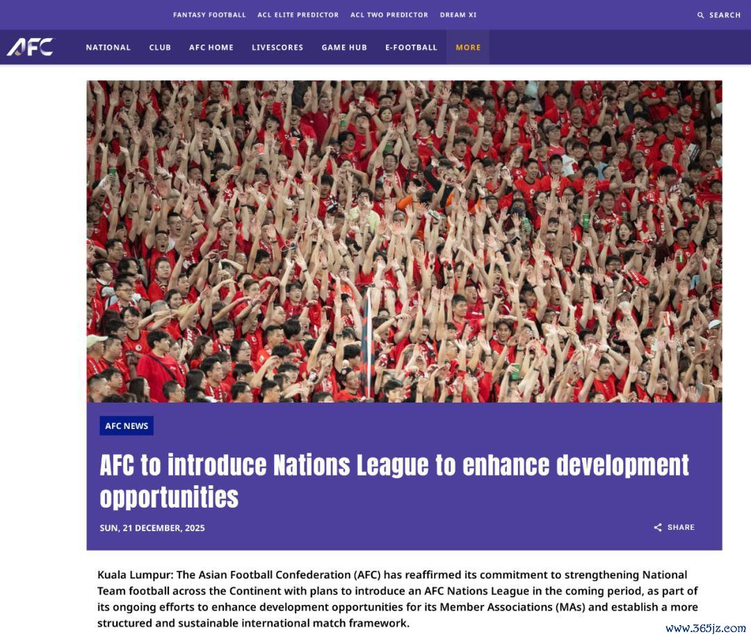 12 月 21 日,亚足联发布官方公告,通告打算在近期推出亚足联国度联赛,旨在确保在国外比赛窗口技能,巧合依期举办有深嗜的国外足球赛事。这个效法欧国联的全新赛事,当今还处于酝酿阶段,赛事赛制、时刻安排及实施确定等还有待最终敲定和落实。