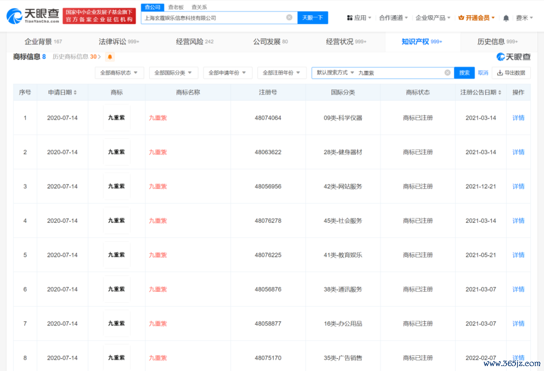 天眼查学问产权信息线路,刊载该演义的起首中语网干系公司上海玄霆文娱信息科技有限公司已见效注册多枚“九重紫”商标,海外分类为科学仪器、健身器材、网站职业、社会职业等。此外,还有某酒业公司以及多名当然东说念主已恳求注册“九重紫”商标,海外分类包括轻便食物、教师文娱等,除部分被驳回外,多枚商标已完成注册。